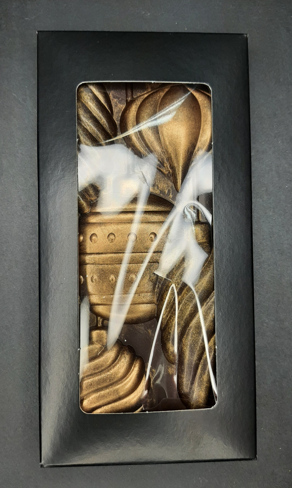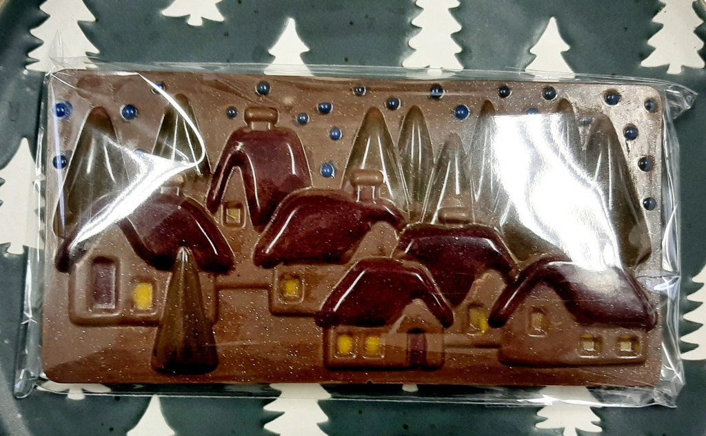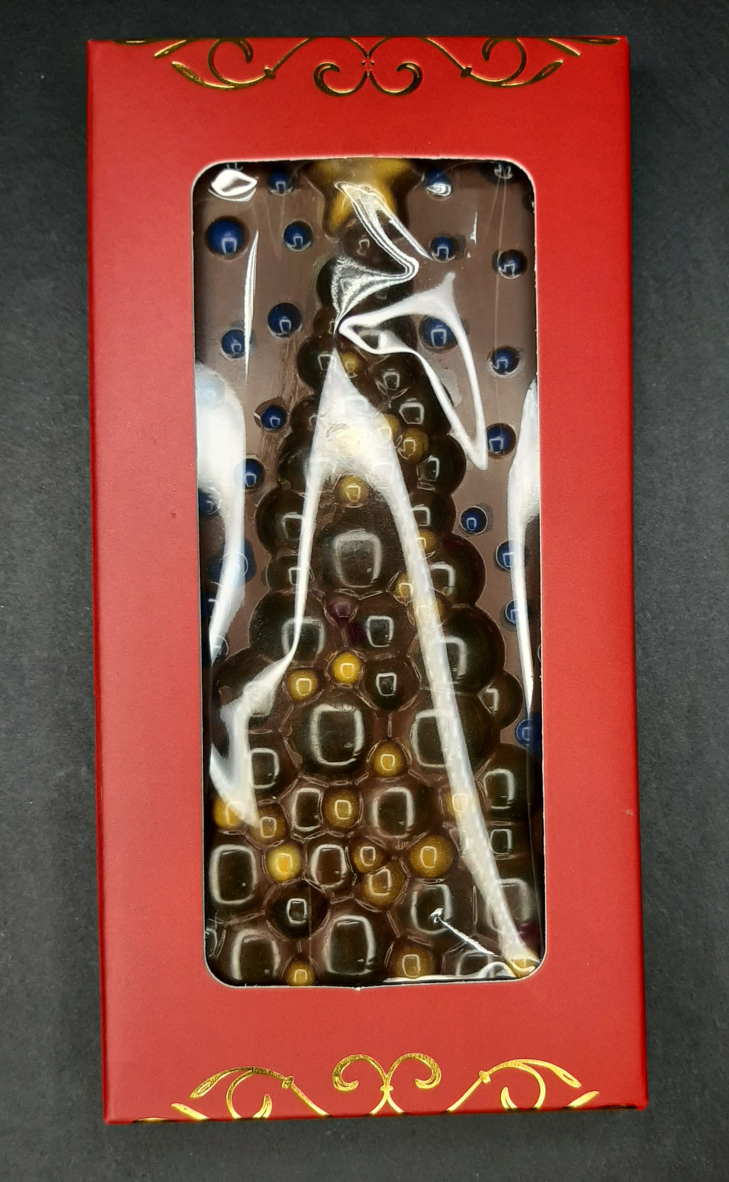 Karácsonyi díszek120 grammos táblás 54,5%-os. Kézműves, bronzporral díszített étcsokoládé. Kellemes, nem keserű,étcsokoládé. A hátulja aszalt meggyel és kókusszeletekkel van szorva.