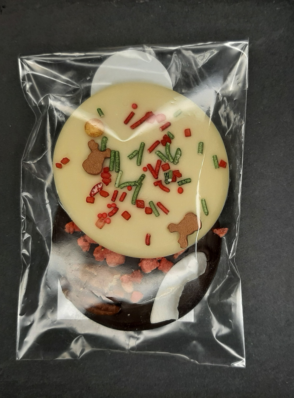 Ét és fehér csokitallér (1-1 darab egy csomagban), 36 gramm. Liofilizált eperdarabokkal, pekándióval és szines cukorkával díszítve.