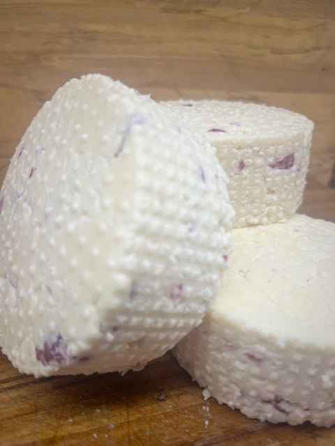 Friss tehéntejből készült lágy gomolya sajt lilahagymás ízben.