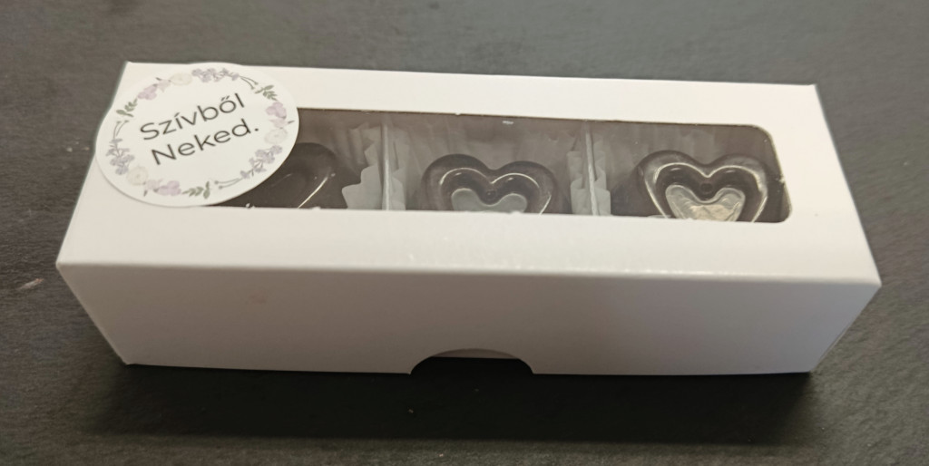 3 darabos bonbon box. 70%os belga étcsokoládé, 3 darab földimogyoró töltelékkel.