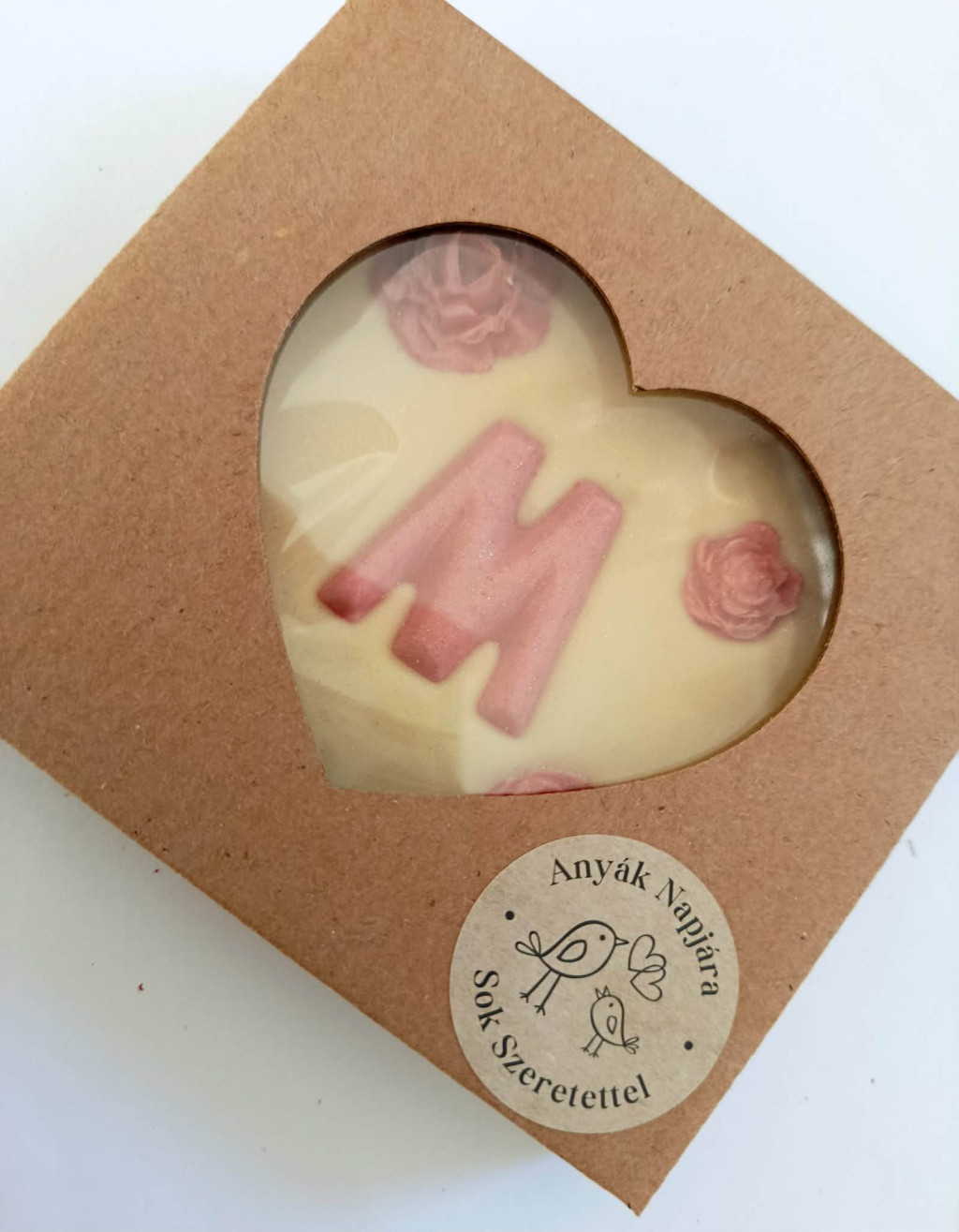 Ez a fehércsokoládé tábla kifejezetten a Nagymamáknak készült. Fehércsokoládéból, középen egy M betű, mely a Mamára utal. Körbeveszi az M betűt sok szép rózsa.