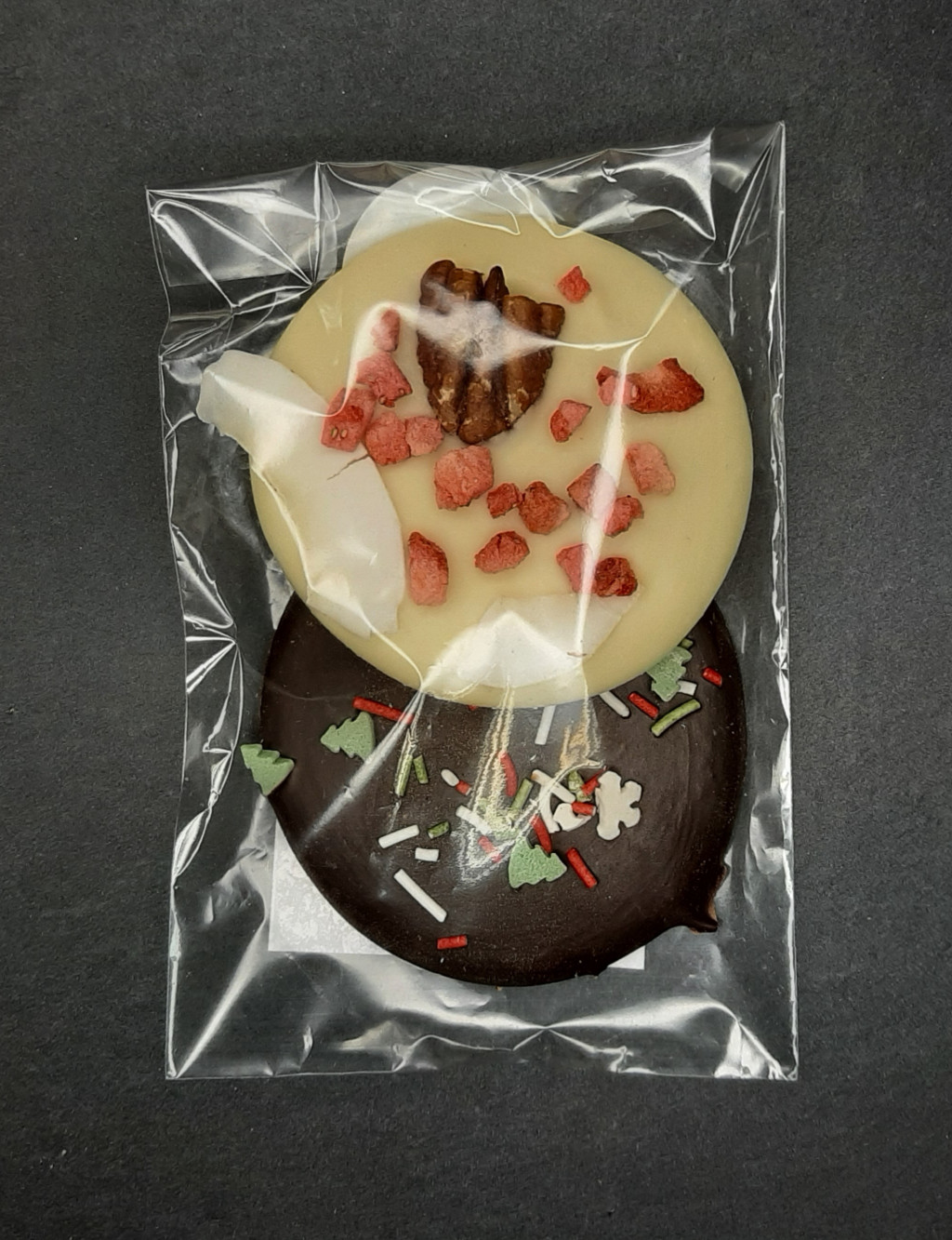 Ét és fehér csokitallér (1-1 darab egy csomagban), 36 gramm. Liofilizált eperdarabokkal, pekándióval és szines cukorkával díszítve.