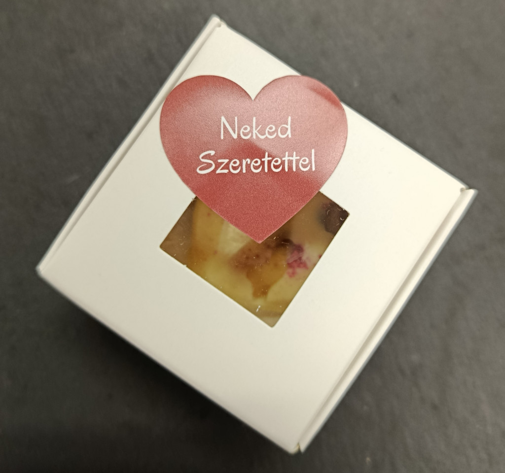 Gyémánt fehér csokoládé szív liofilizált gyümölccsel és magvakkal díszdobozban. Az édes fehér csokoládé harmóniában van a savanykás gyümölcsökkel.