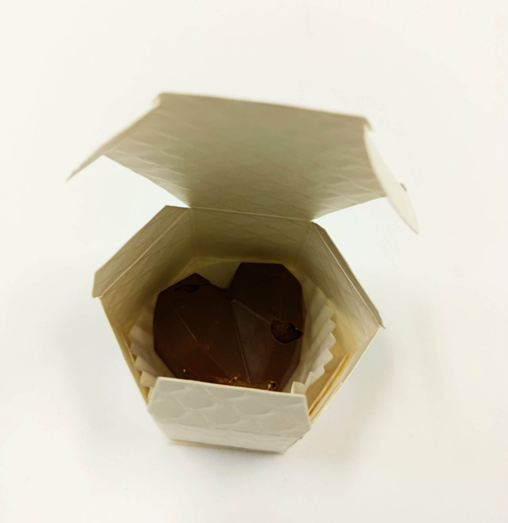 Gyémánt tejcsokoládé szív liofilizált gyümölccsel és magvakkal díszdobozban. Az tejcsokoládé harmóniában van a savanykás gyümölcsökkel.