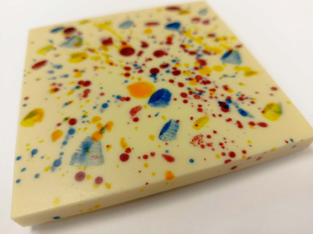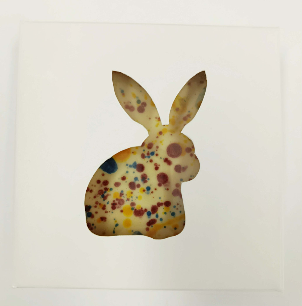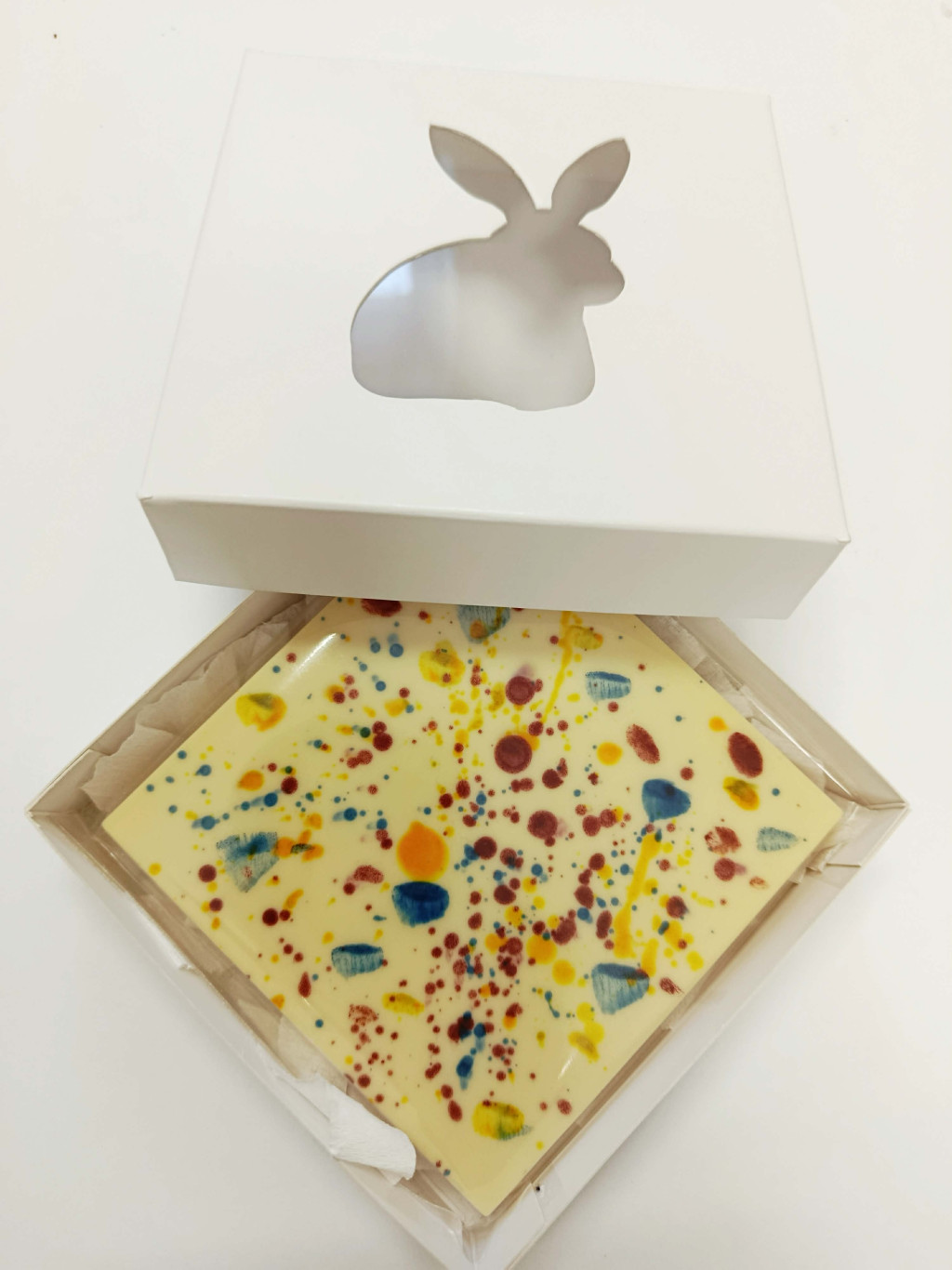 Négyzet alakú táblás fehércsokoládé, elől húsvéti hangulatú szinezés. Természetes színezék, mint kék spirulina alga, kurkuma, fekete répa por.. Díszdobozban. Kiváló húsvéti ajándék felnőtteknek is.