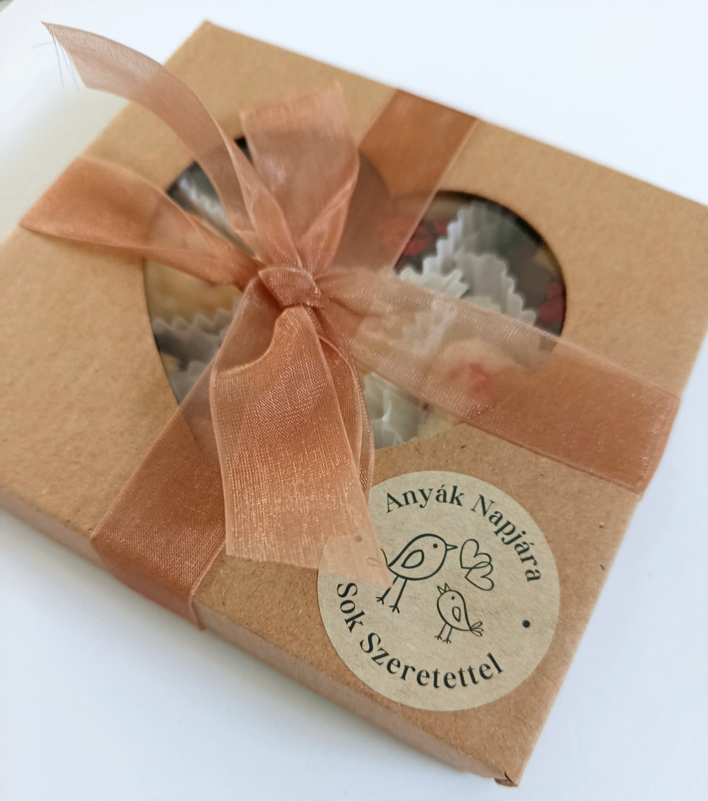 Natúr színű dobozban, szalaggal átkötve, anyák napi matricával.