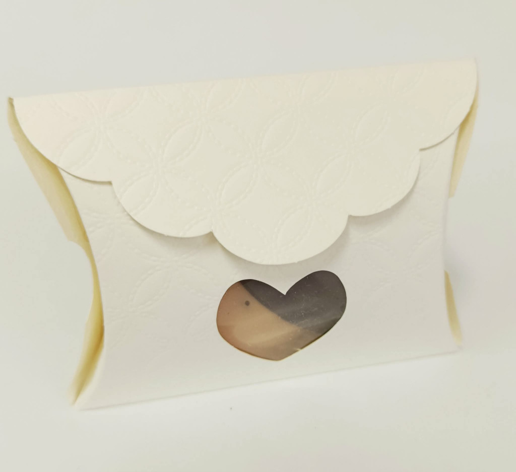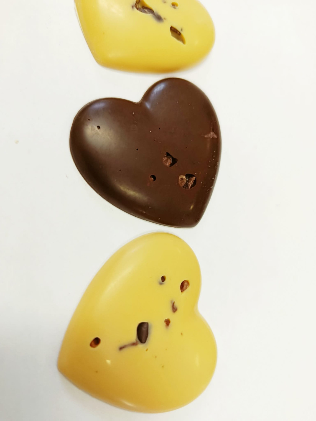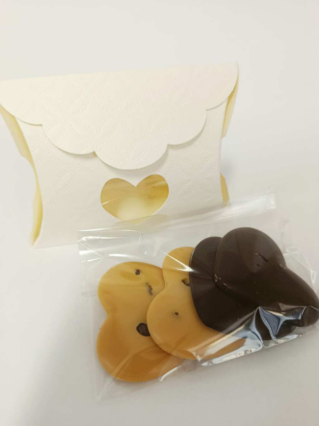 Csokoládé szívek ét és karamellizált fehércsokoládéból. Kakaóbab törettel szorva, szivecskés boríték dobozban.