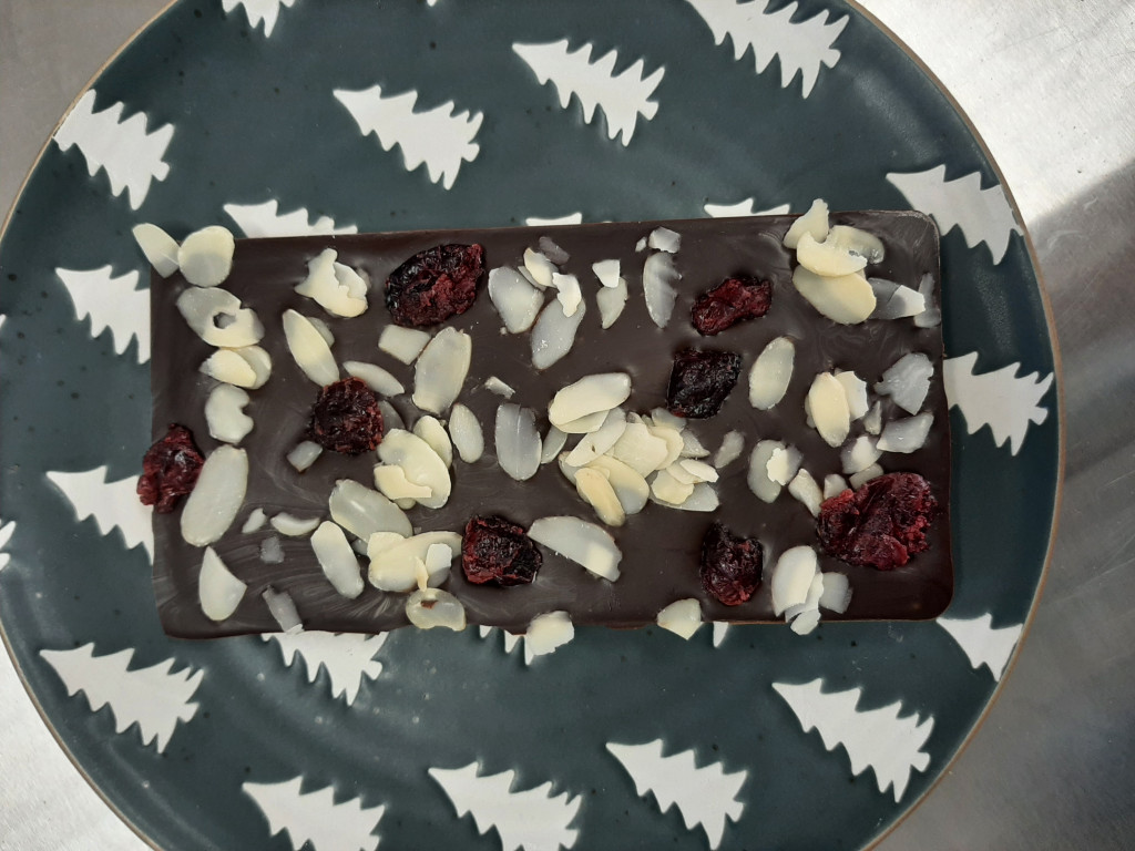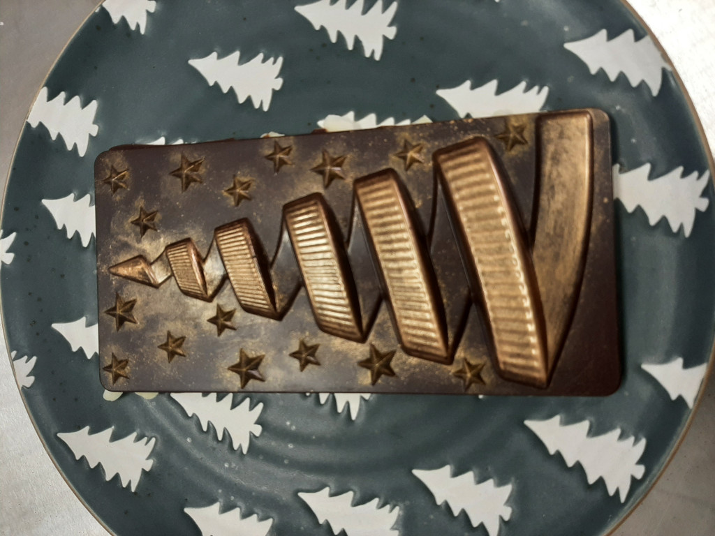 Bronz karácsonyfa 125 grammos táblás 54,5%-os. Kézműves, bronzporral díszített étcsokoládé. Kellemes, nem keserű,étcsokoládé. A hátulja aszalt áfonyával és mandulával van szorva.
