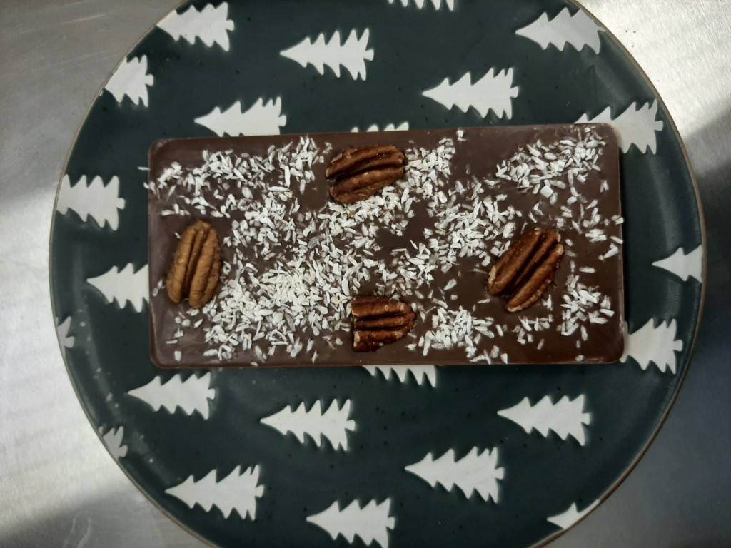 Karácsonyfa 100 grammos táblás tejcsokoládé. Kézműves, festett tejcsokoládé. A színezés természetes alapanyagokból, mint spirulina alga, kurkuma, matcha, fekete répa por. Selymes belga csokoládé. A hátulja pekándióval és kókusszal szorva.