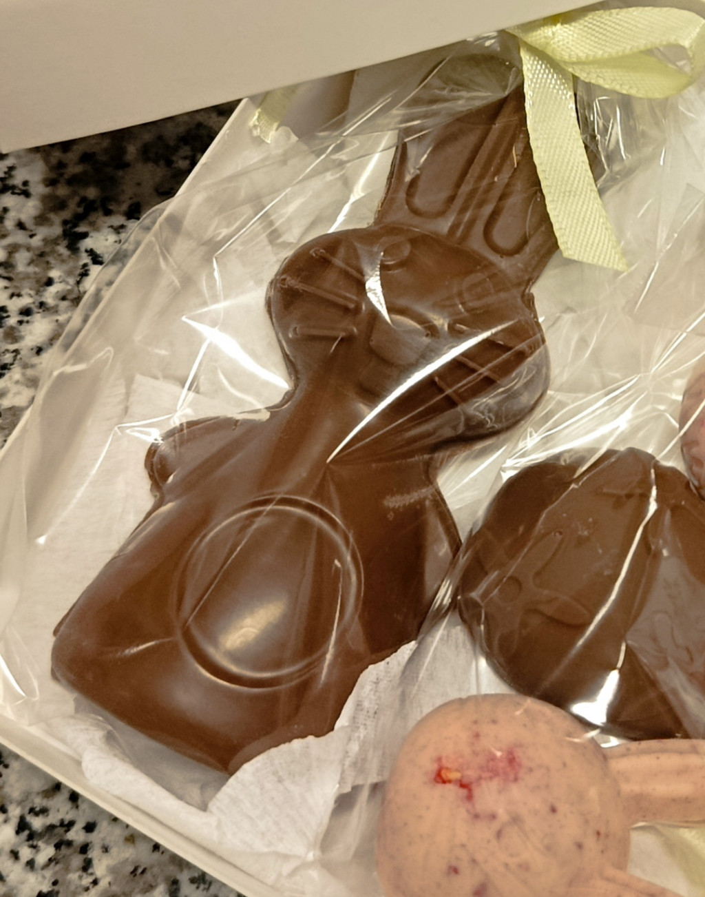Málna krémmel töltött tejcsoki nyuszi. Vagy a pocakja vagy a kis pamacsa kerül hozzád. Aranyos, finom figyelmesség húsvétra.