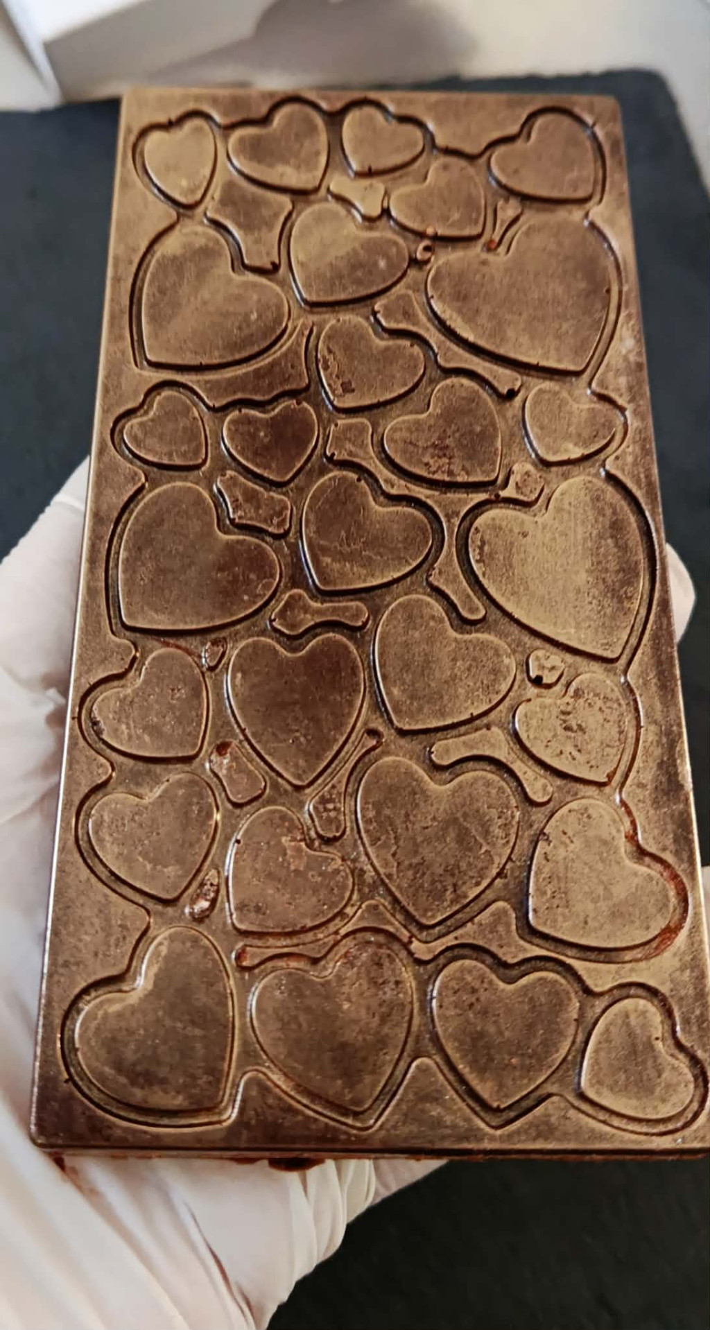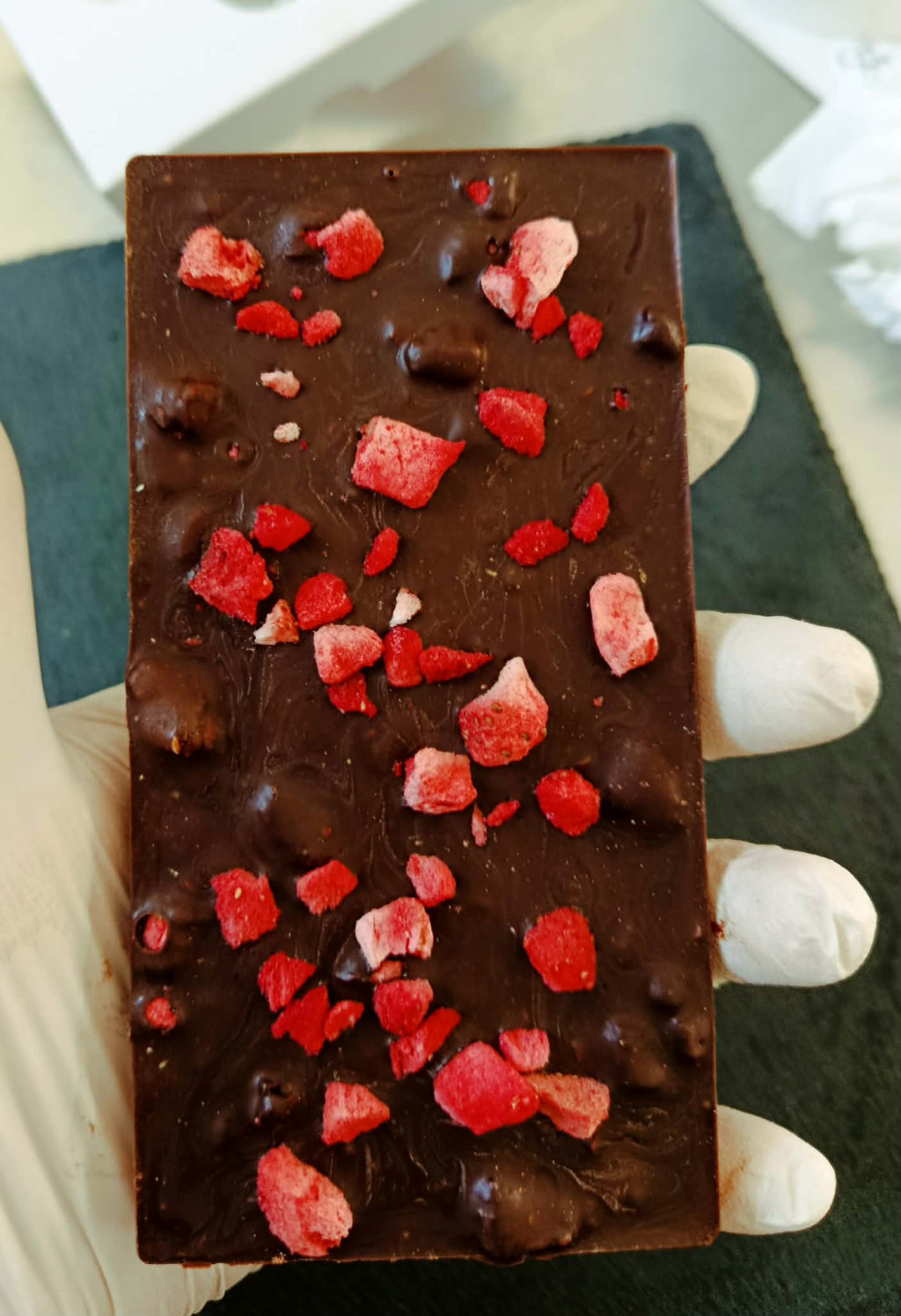 Szivecskés motívumú étcsokoládé tábla pisztáciával és eper darabokkal, hátulja megszorva pluszban eperrel. Ablakos dobozban