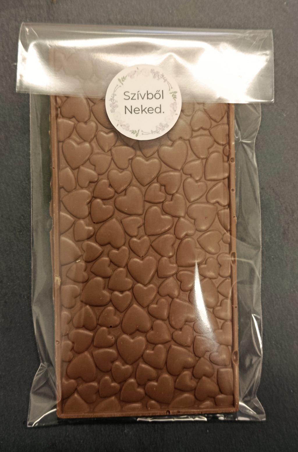 Táblás tejcsokoládé, hátulja fehér csokoládé virággal és szívvel díszítve. Másik oldala szív mintával.