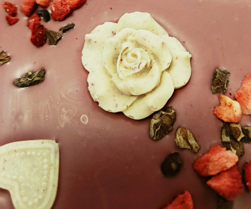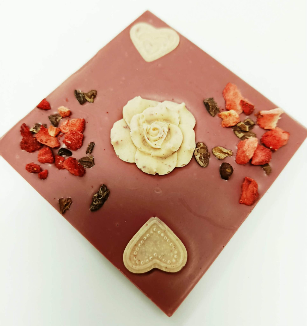 Négyzet alakú táblás ruby (eredendően rózsaszín, gyümölcsös ízvilágú) tejcsokoládé liofilizált málnás fehércsoki díszekkel. Liofilizált eperrel és kakaóbab törettel szorva. Egyedi megjelenés, gyümölcsös ízvilág. Díszdobozban.